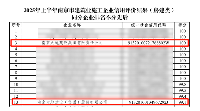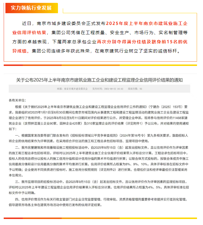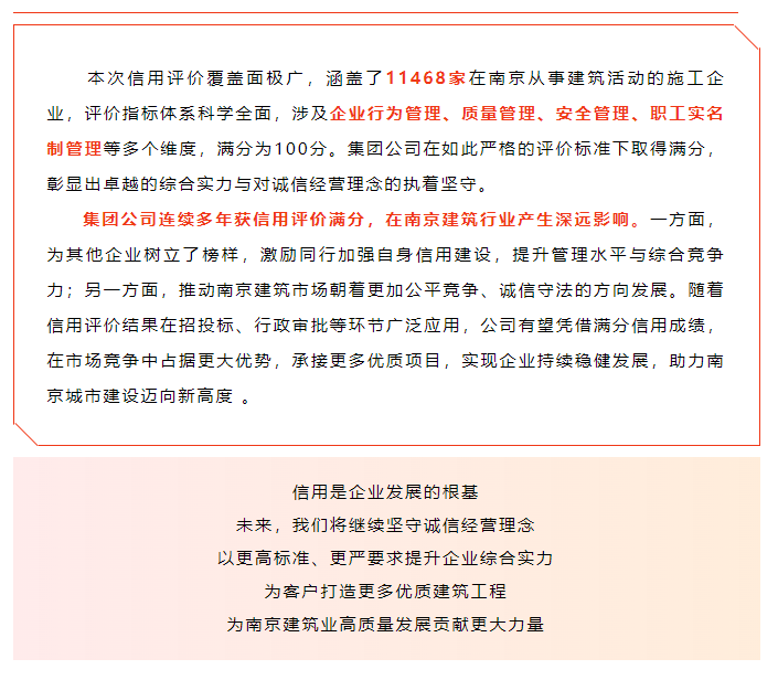 集团再获南京市建筑业施工企业信用评价满分