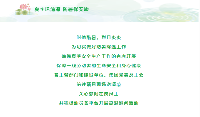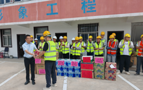 8月15日下午,集团工会主席、集团公司党群部部长朱亚萍、有限责任公司党委书记顾卫东一行来到软件园中学项目部,开展“送清凉”活动,为高温作业的员工送上矿泉水、酸梅汤等防暑物资,实地了解员工工作和生活情况。
